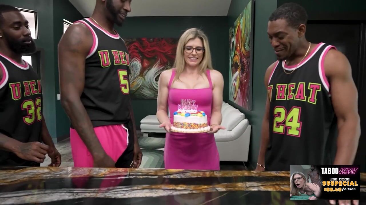 Развратная зрелая блондинка с сексуальными титьками и упругой пышной попой отмечает день рождения с троими мускулистыми молодыми неграми и получает в подарок развратный межрасовый групповой секс. Девушка глубоко отсасывает и надрачивает большие черные члены, затем, горячо стонет от двойного проникновения и принимает выстрелы спермы в рот и на лицо