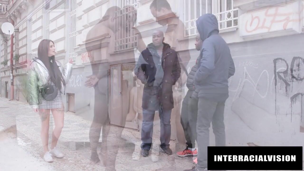 Трое чернокожих парней тусовались на углу своего квартала, к ним подошла сногсшибательная молодая брюнетка в мини юбке и начала развратно флиртовать. Друзья не могли поверить как круто им повезло пока не привели развратницу домой и не насладились королевским межрасовым минетом, а затем, ублажили девушку болезненным двойным проникновением