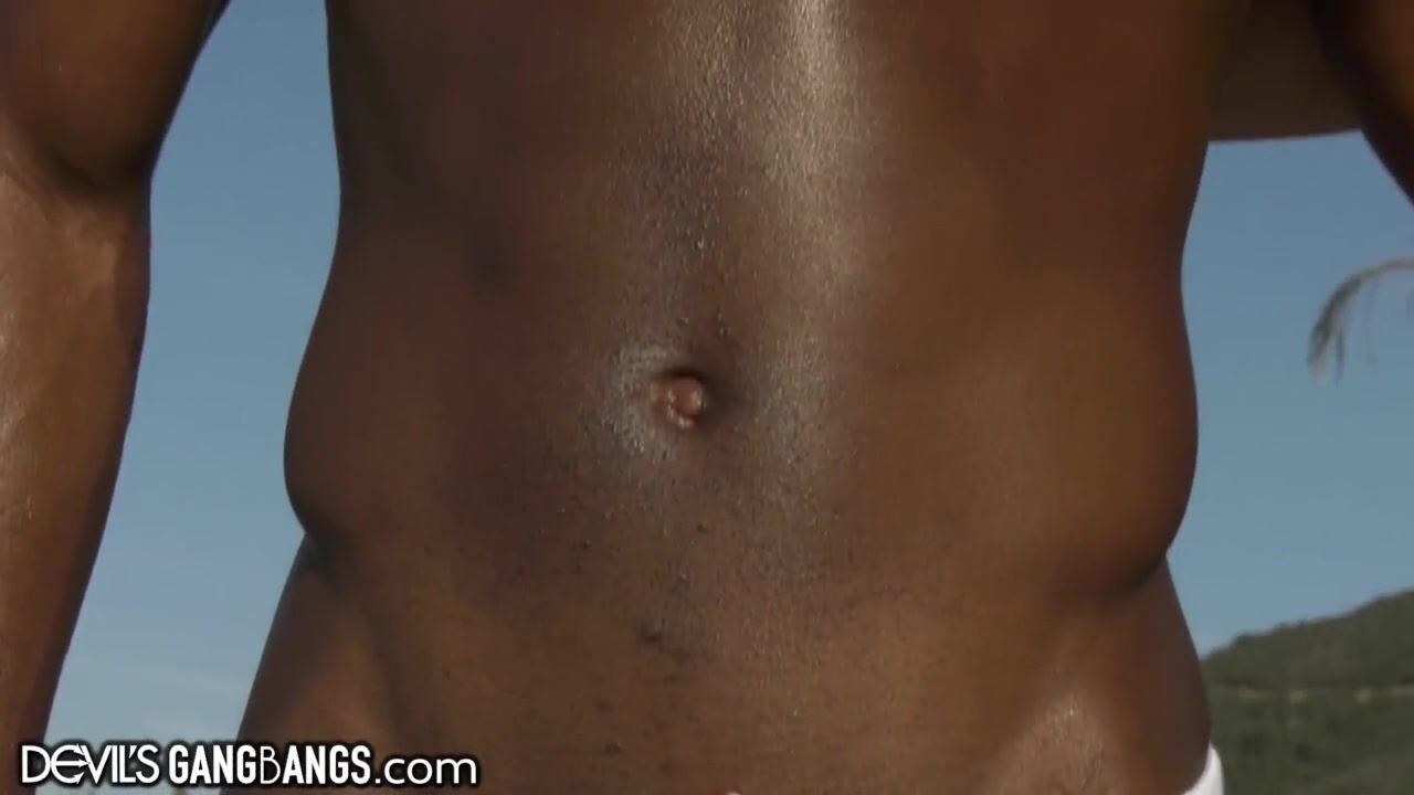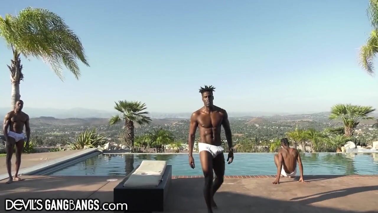 Брюнетка, молоденькая нежная девушка с красивыми упругими титьками и стройной талией, сидела у бассейна в эротичном белье нежно массируя бритую киску не замечая наблюдающих за ней четверых вожделенных негров. Парни затащили красотку в дом, хорошенько исследовали ее глубокую глотку и приступили грязно долбить во все дыры большими черными членами